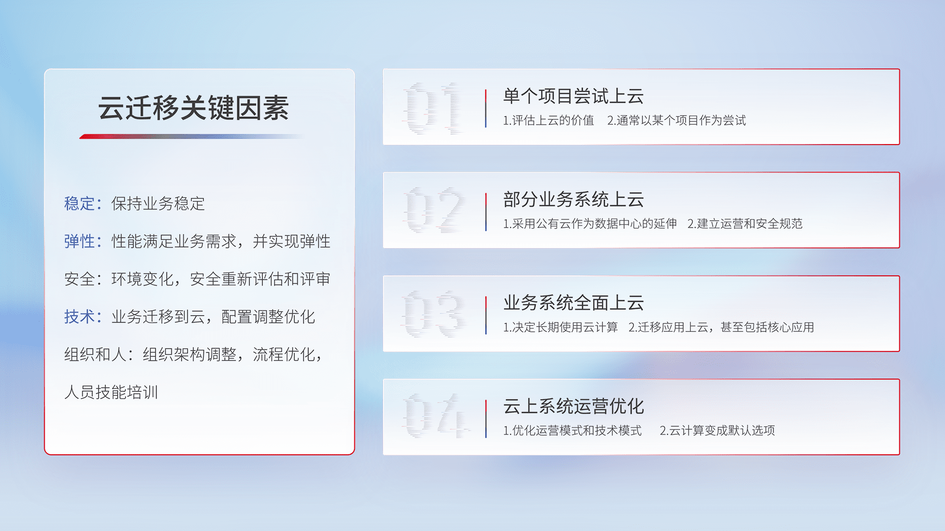 结合实际业务,,,,从规划设计、、云平台选型、、、云原生改造、、数据迁移、、、集成交付,,迁移全过程为客户识别最佳上云路径,,做好风险识别管理,,设计网络架构、、、、身份权限、、、、安全审计合规、、操作审计、、、日志审计、、监控告警策略、、、、多站点容灾设计等,,,,对云上基础设施进行整体规划,,,,提升IT治理水平,,,以满足弹性、、、高可用、、、、高性能的需求。。。