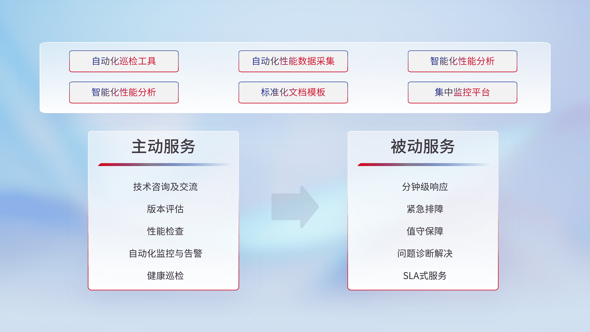 智能化工具和标准化文档,,,,保障服务质量,,,,提供主动服务(包含技术咨询、、、版本评估、、、性能检查、、自动化监控与告警、、健康巡检)和被动服务包含(分钟级响应、、、紧急排障、、、、值守保障、、、问题诊断解决、、、、SLA服务)。。。