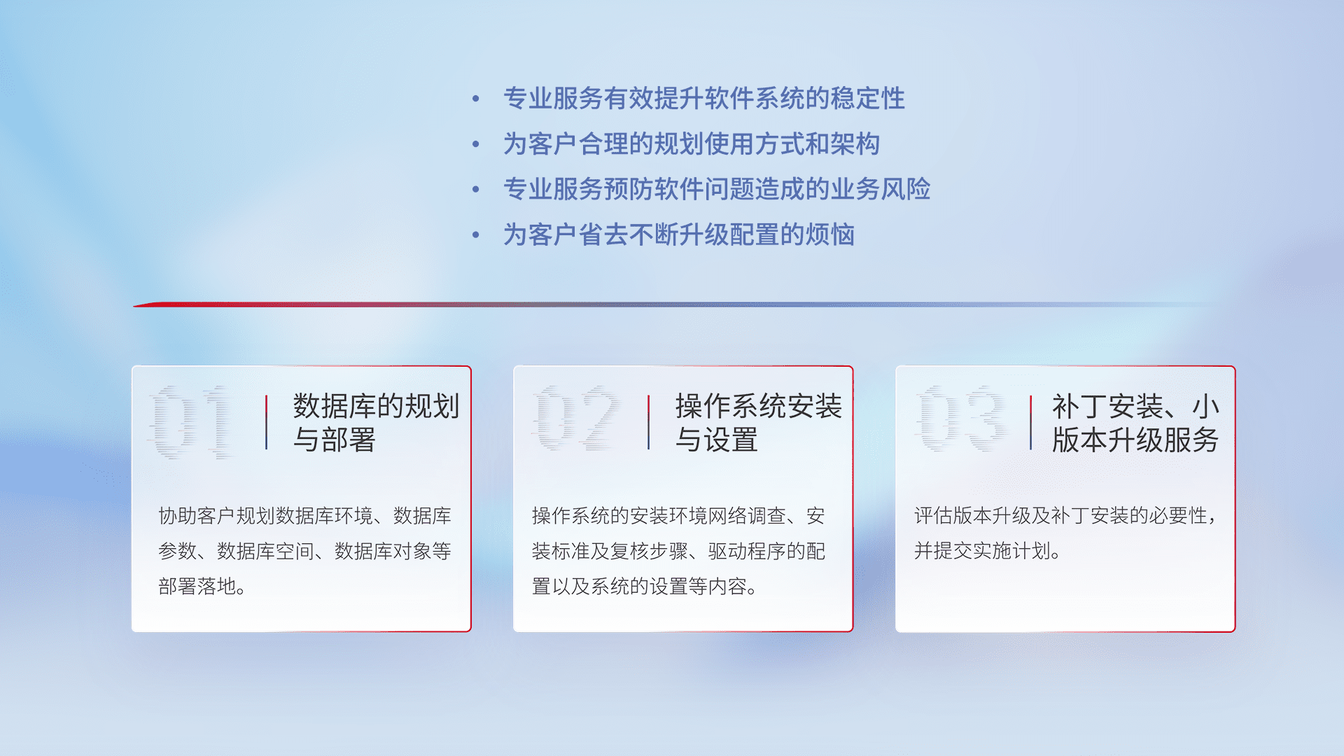 为客户提供软件规模升级、、、、快速部署、、、按需配置的专业服务,,从数据库的规划与部署到操作系统的安装与设置,,,再到补丁安装和小版本升级提供支持。。。。