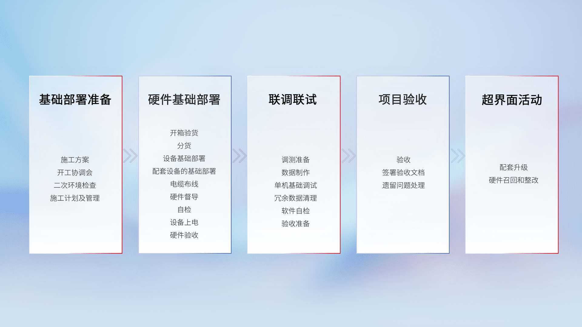 从基础部署准备、、、硬件基础部署、、联调联试、、、项目验收、、越界面活动的全过程可追溯,,,保证施工质量和进度。。。。